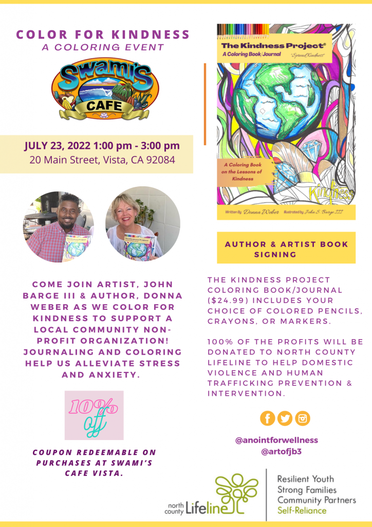 Come join artist, John Barge III and author, Donna Weber as we Color for Kindness to support a local community non-profit organization, North County Lifeline on Saturday, July 23, 2022!
